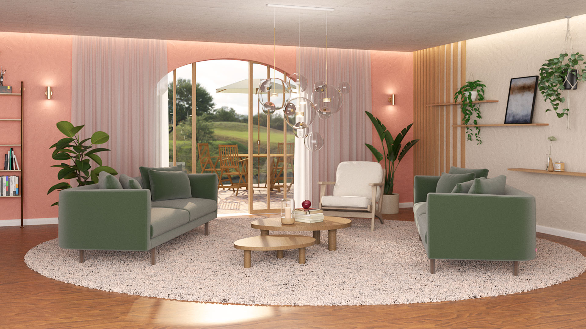 Rendu photoréaliste d'un salon cosy inspiré par des éléments aux formes et matières naturelles.