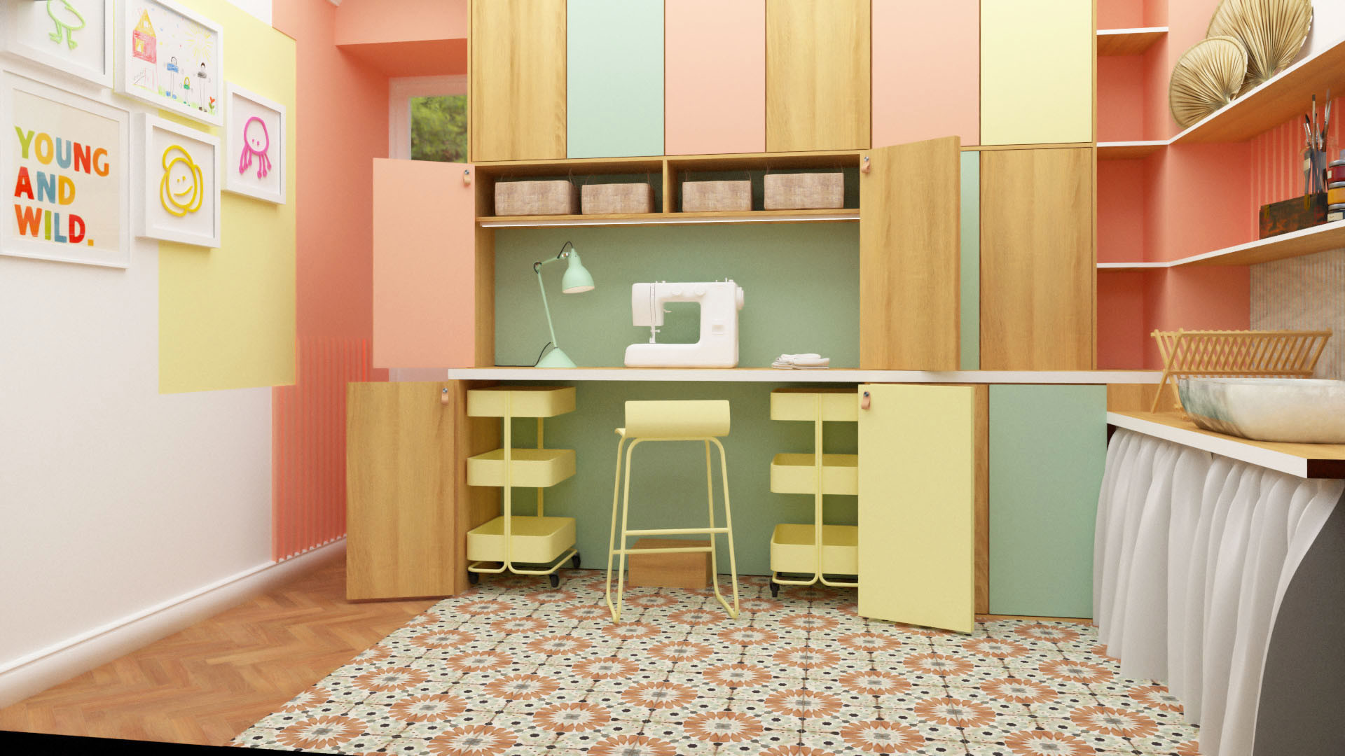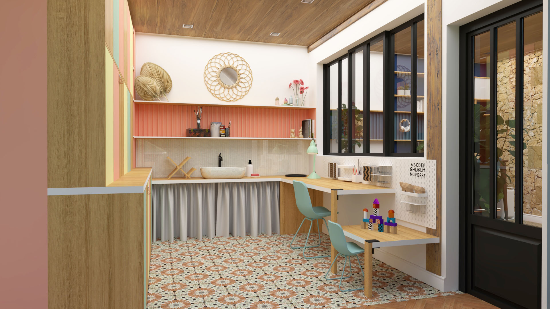 Le second côté est lui dédié aux arts créatifs tels que le dessin, la peinture, la couture ou en encore le petit bricolage. Cet espace fonctionnel et coloré instille une dynamique plus forte pour favoriser la créativité. Un coin couture est caché dans l'ensemble de rangement et à l'avantage de pouvoir arrêter et reprendre les travaux en cours, sans avoir à tout ranger à chaque session de couture. Un plan table à hauteur d'enfant est prévu pour s'amuser en famille.