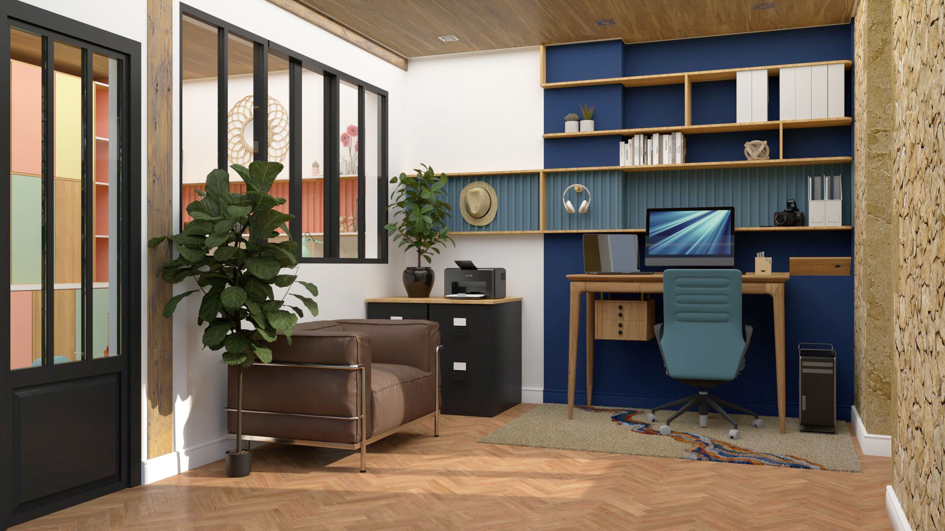 Conversion d'une ancienne cuisine en une pièce double, d'un côté un bureau professionnel et de l'autre un atelier pour les arts créatifs. Le projet réussi à intégrer deux fonctions et deux ambiances différentes en créant une unité visuel grâce à l'aménagement et la décoration tout en les dissociant par l'utilisation de la couleur. Une cloison centrale accueillant une porte vitrée et une verrière atelier permet la circulation des personnes et de la lumière entre les deux espaces.