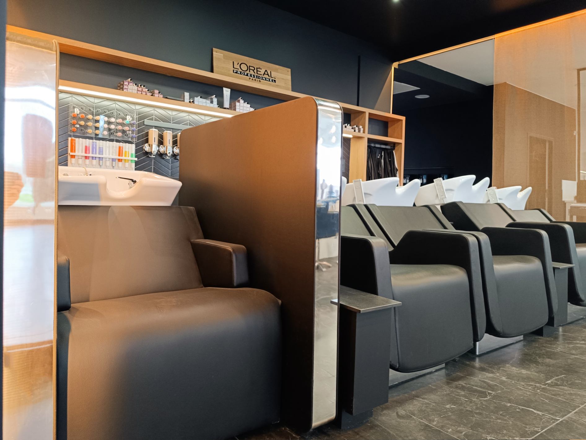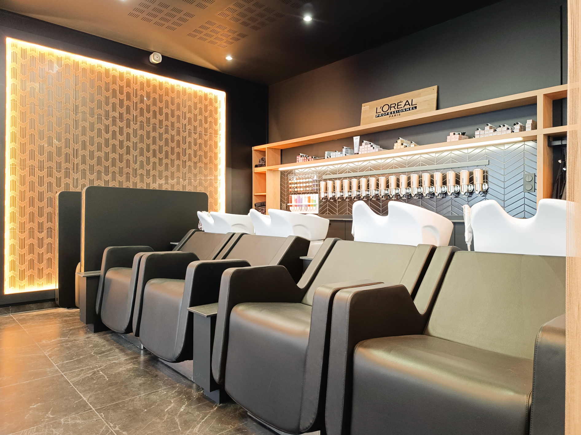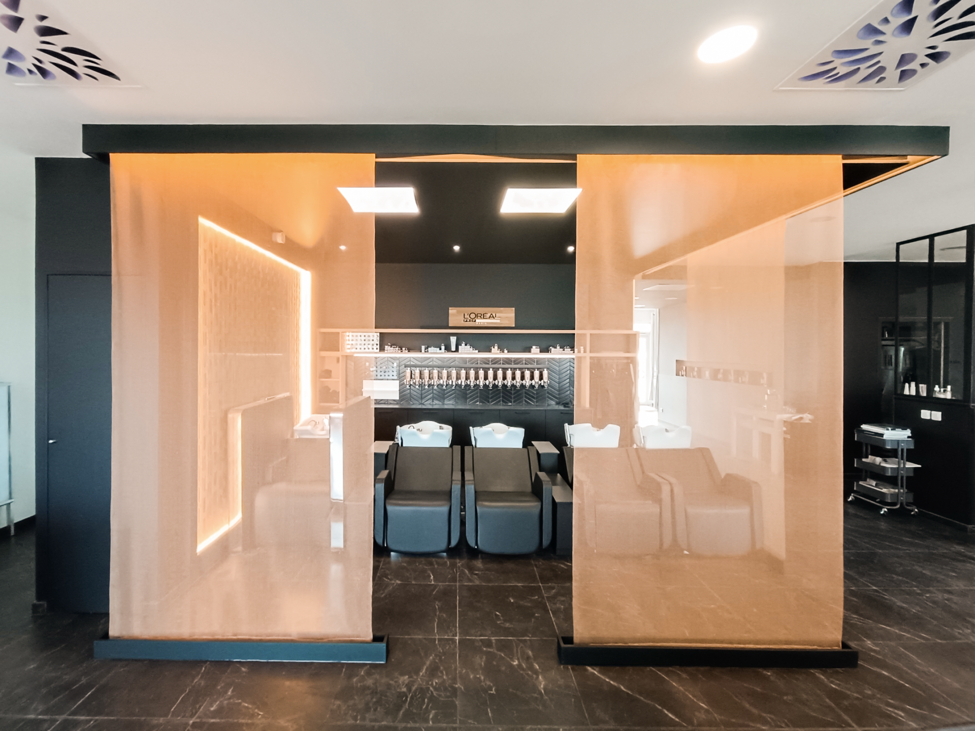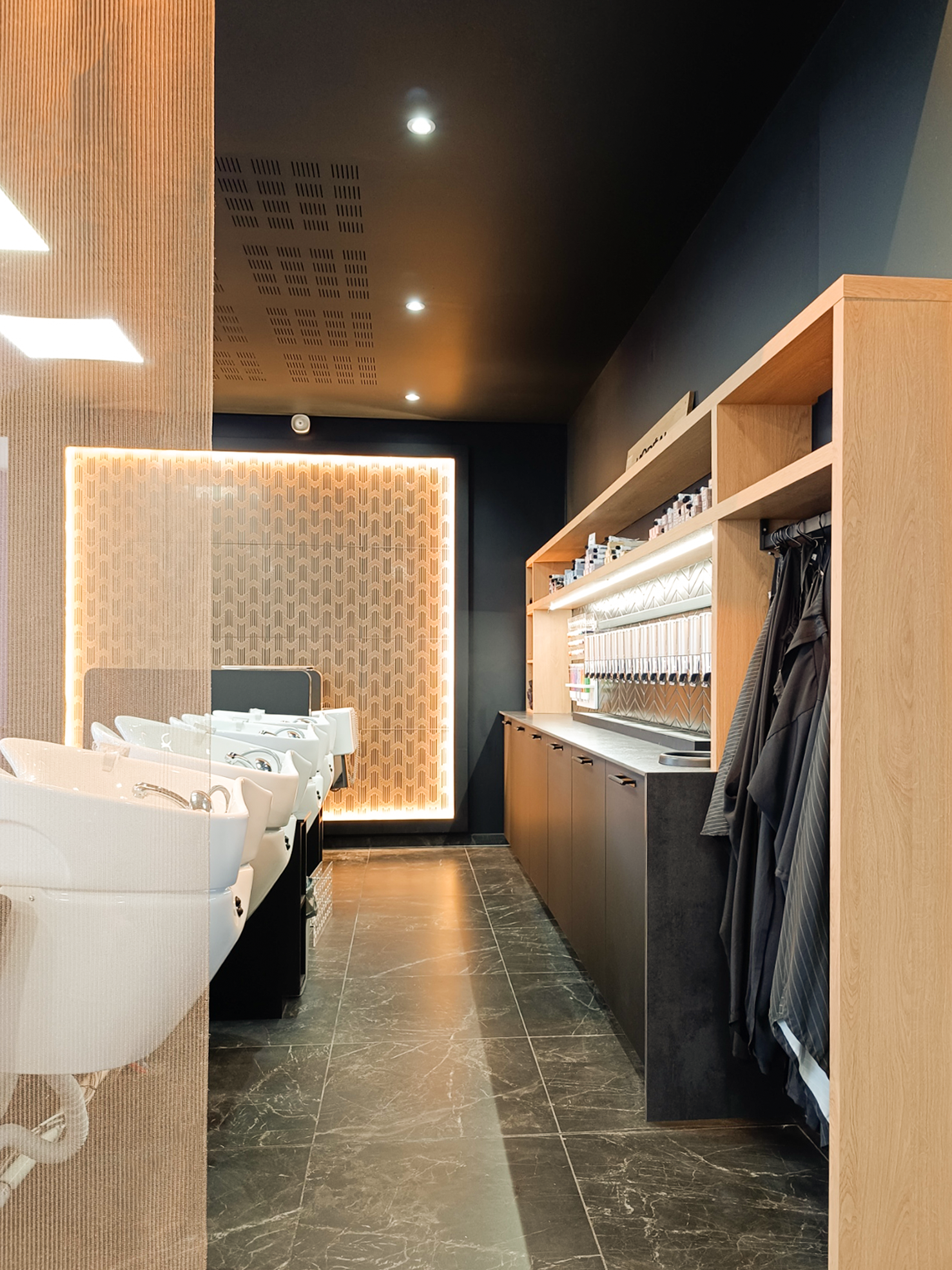 Projet de rénovation d'un espace bac à shampoing dans un salon de coiffure en Gironde. L'espace est repensé autour de 5 nouveaux bacs à shampoing dont un bac spa. La nouvelle circulation est revue grâce à des rideaux en métal tissé qui créent un espace calme, serein et isolé du reste du salon, tout en conservant la belle perspective offerte par ce grand salon de coiffure. Un agencement sur mesure complète l'ensemble, intégrant notamment divers rangements, une penderie ouverte et un bar à shampoing. Pour terminer, une mise en lumière pensée entre fonctionnalité et esthétique, sublime les différents éléments.