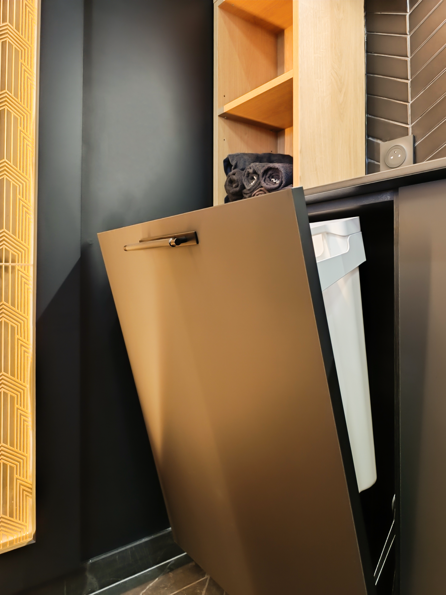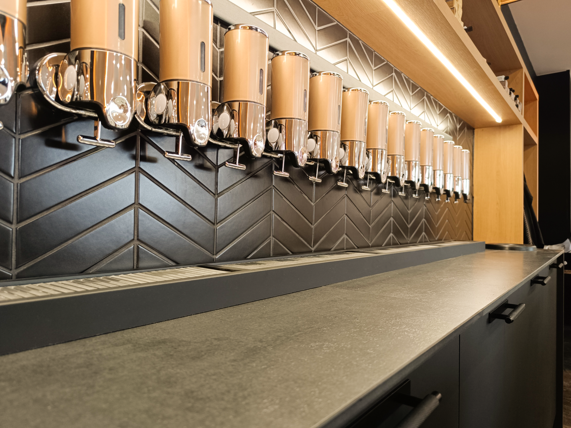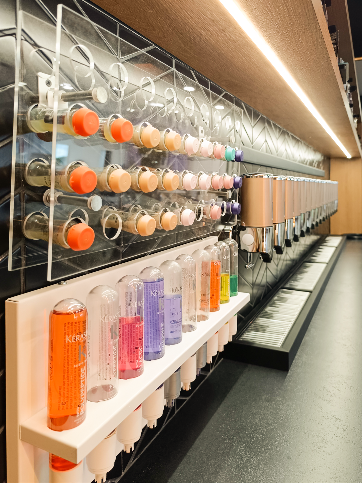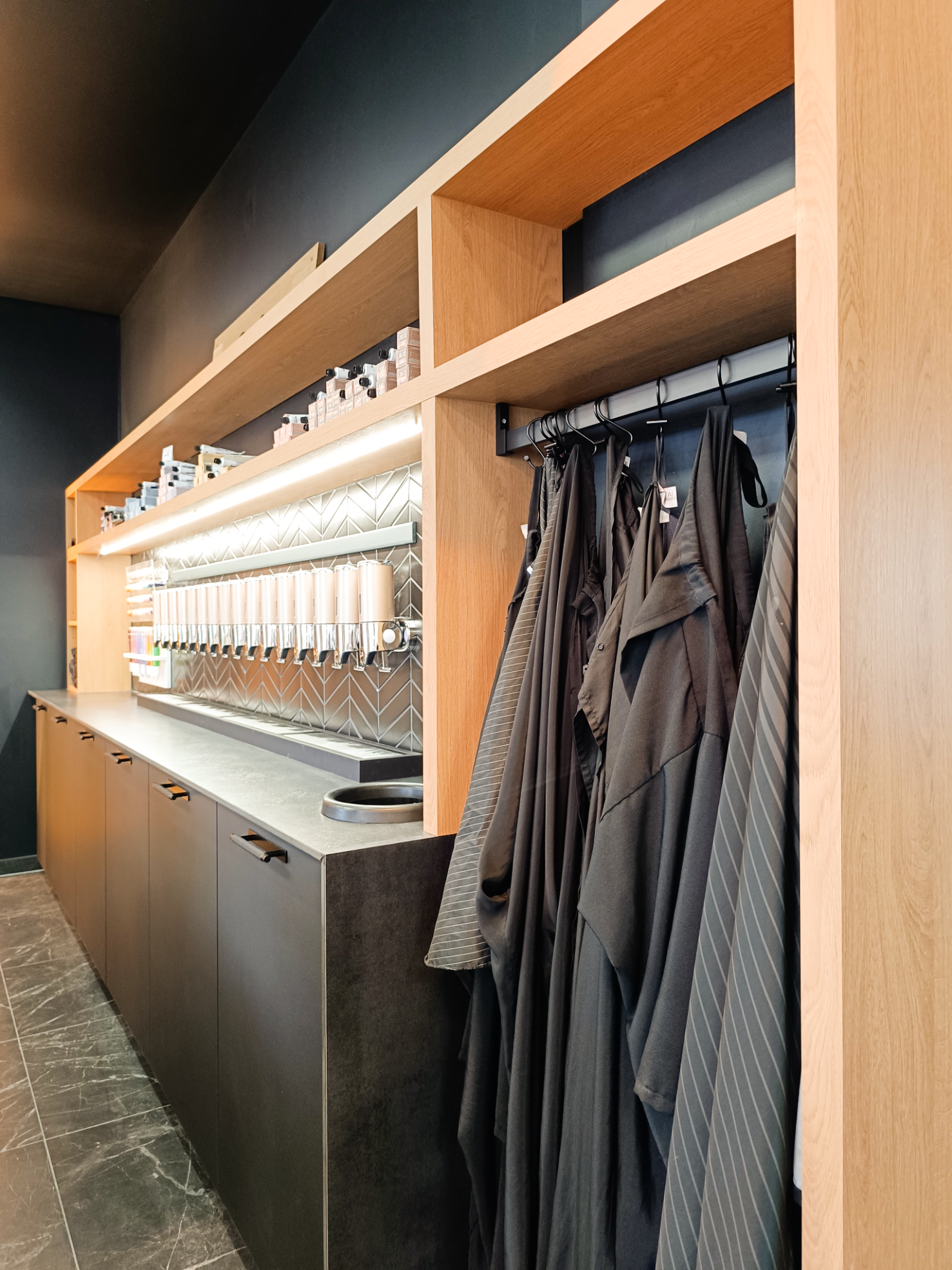 Projet de rénovation d'un espace bac à shampoing dans un salon de coiffure en Gironde. L'espace est repensé autour de 5 nouveaux bacs à shampoing dont un bac spa. La nouvelle circulation est revue grâce à des rideaux en métal tissé qui créent un espace calme, serein et isolé du reste du salon, tout en conservant la belle perspective offerte par ce grand salon de coiffure. Un agencement sur mesure complète l'ensemble, intégrant notamment divers rangements, une penderie ouverte et un bar à shampoing. Pour terminer, une mise en lumière pensée entre fonctionnalité et esthétique, sublime les différents éléments.